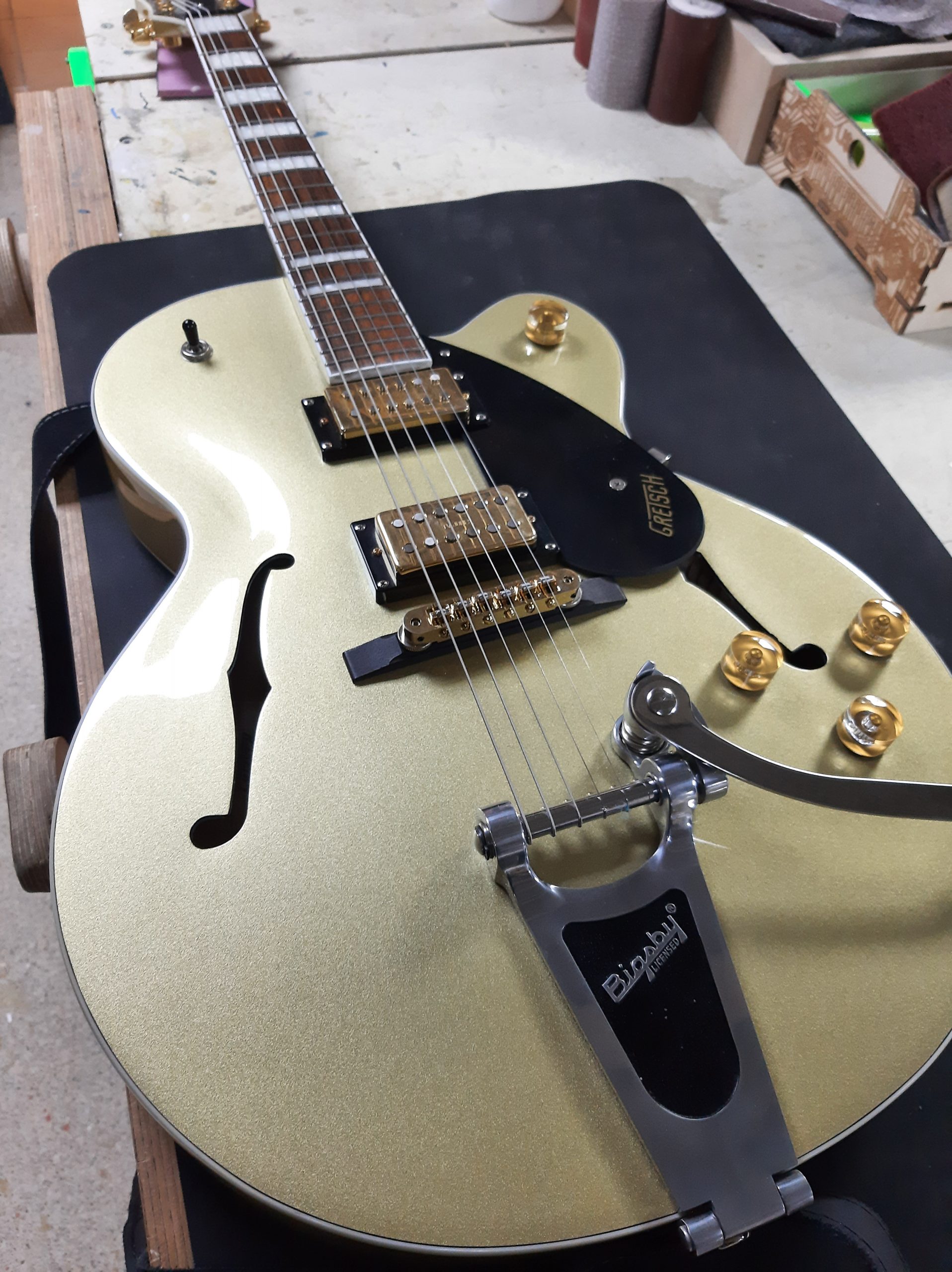 A cette étape, je n’ai pas identifié la cause du problème : il faut aller plus loin… Sur une hollowbody, pas de trappes électroniques comme sur les solidbody : c’est un peu plus long.