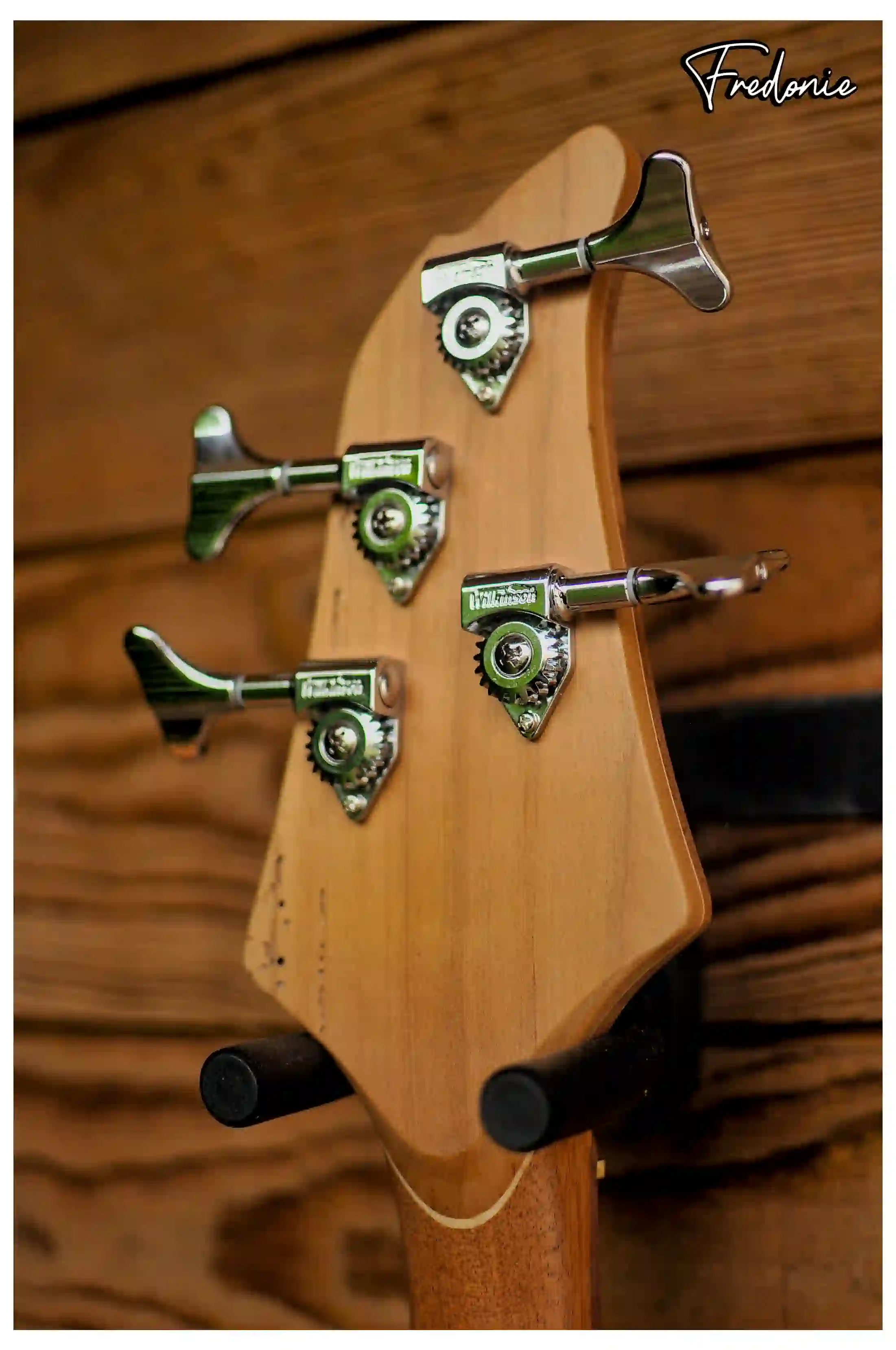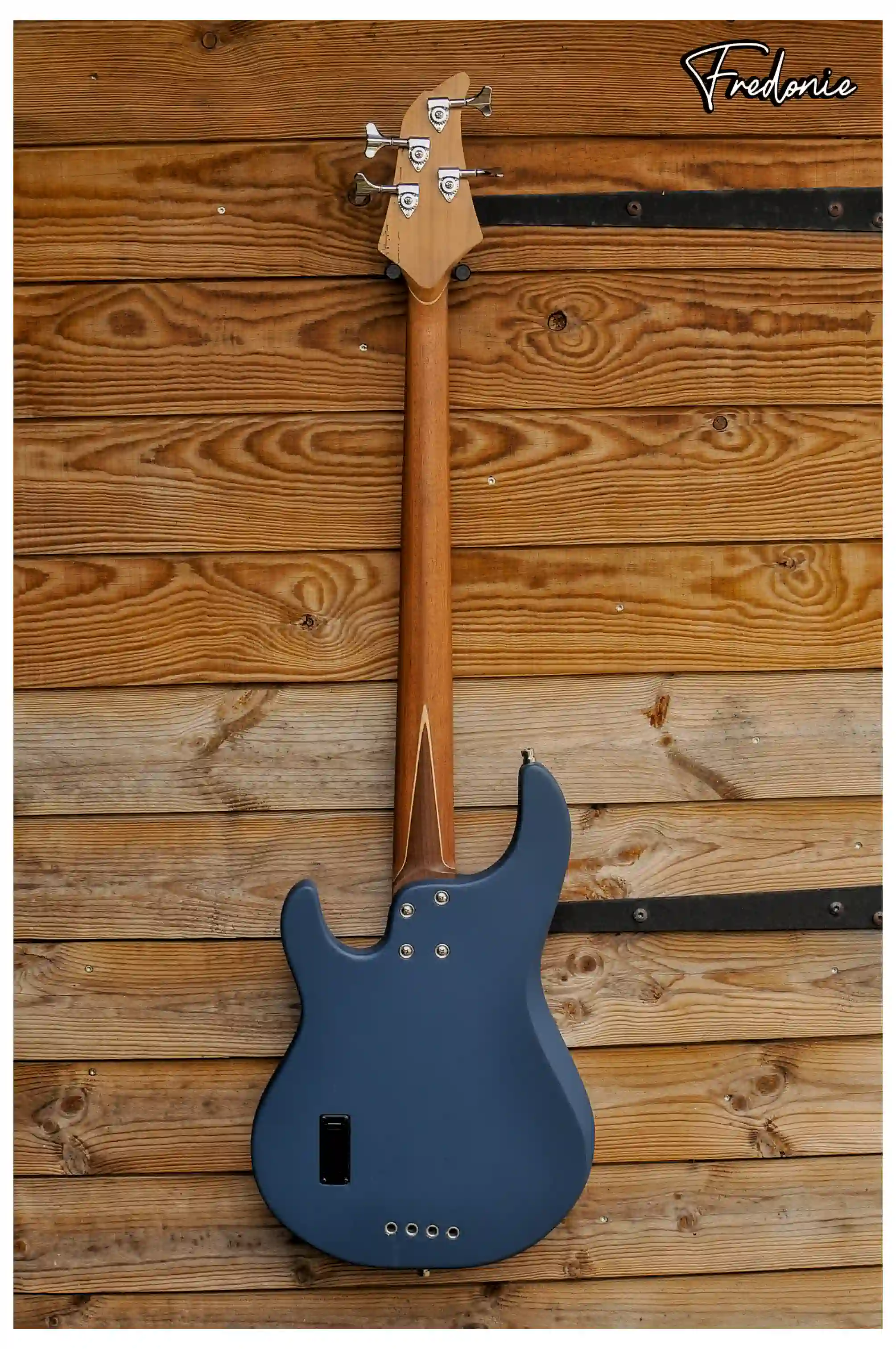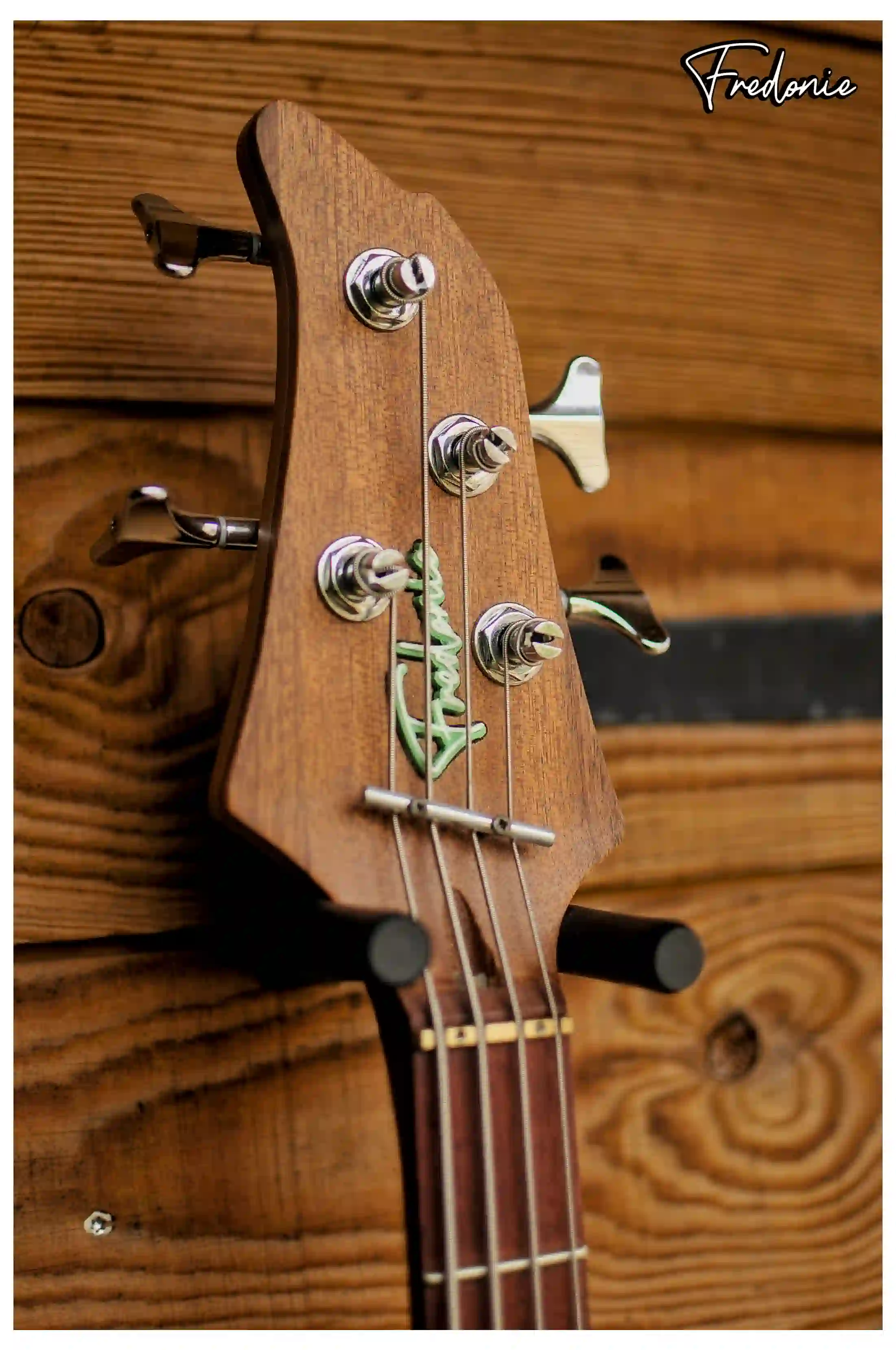 Étant bassiste, j’ai toujours été attiré par le design des basses MM. Ici, nous avons une 4 cordes avec un micro EMG actif, un manche en V et une largeur fine de sillet de tête (style JB avec 42 mm). Manche sipo et touche amarante, corps épicéa, cordier traversant, et finition mat. Une basse taillée simplement pour être efficace.